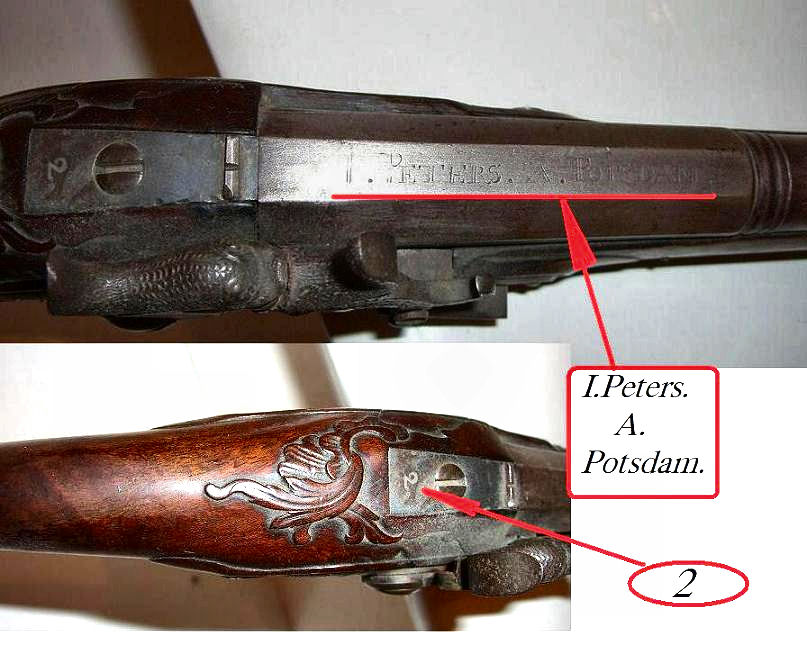 Das ist eine Pistole, welche von Büchsenmacher Johannes Peter aus Potsdam gefertigt wurde. Johannes Peter war Sohn des Hofbüchsenmachers Johann Wolf Peter, der für Fürst Albrecht Ernst II. von Öttingen in Bayern gearbeitet hat. Auch sein Sohn Johannes ist in Öttingen nachweisbar, verzog aber dann offensichtlich nach Potsdam, wo er für das Jahr 1732 aktenkundig ist.