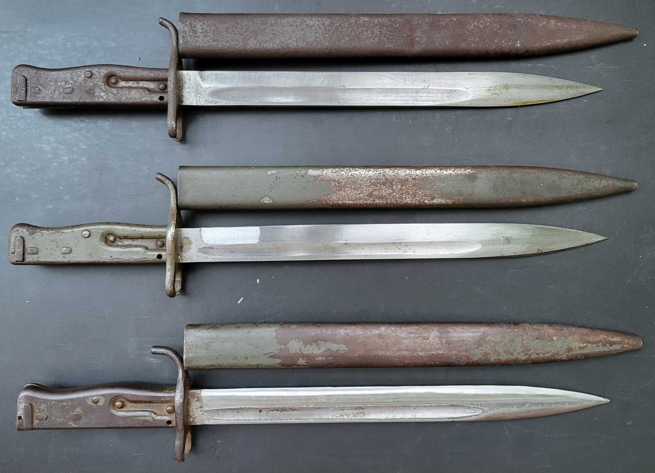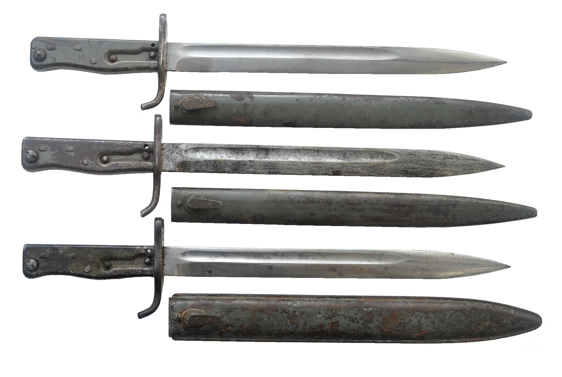 Hier zeige ich drei Aushilfsseitengewehre dieses Modells und dann jeweils die zugehörigen Abnahmestempel auf dem Klingenrücken und der Fehlschärfe von oben nach unten.