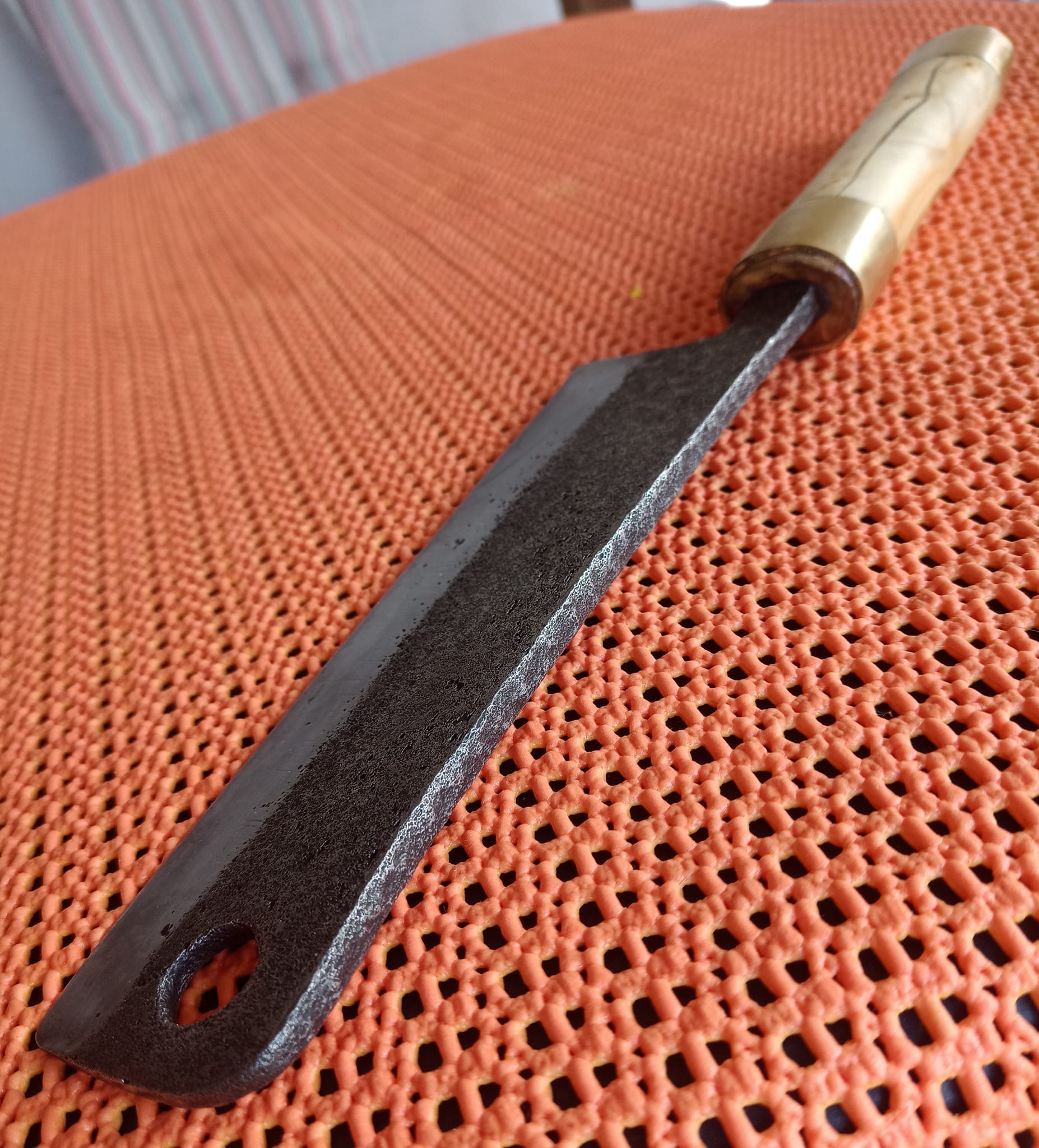 Der Erl ist mit Holzleim ins Heft eingeschoben, wodurch der Riss gleich mit geleimt wurde und die beiden Messingringe halten alles stabil. Griffholz mit Leinöl geölt.