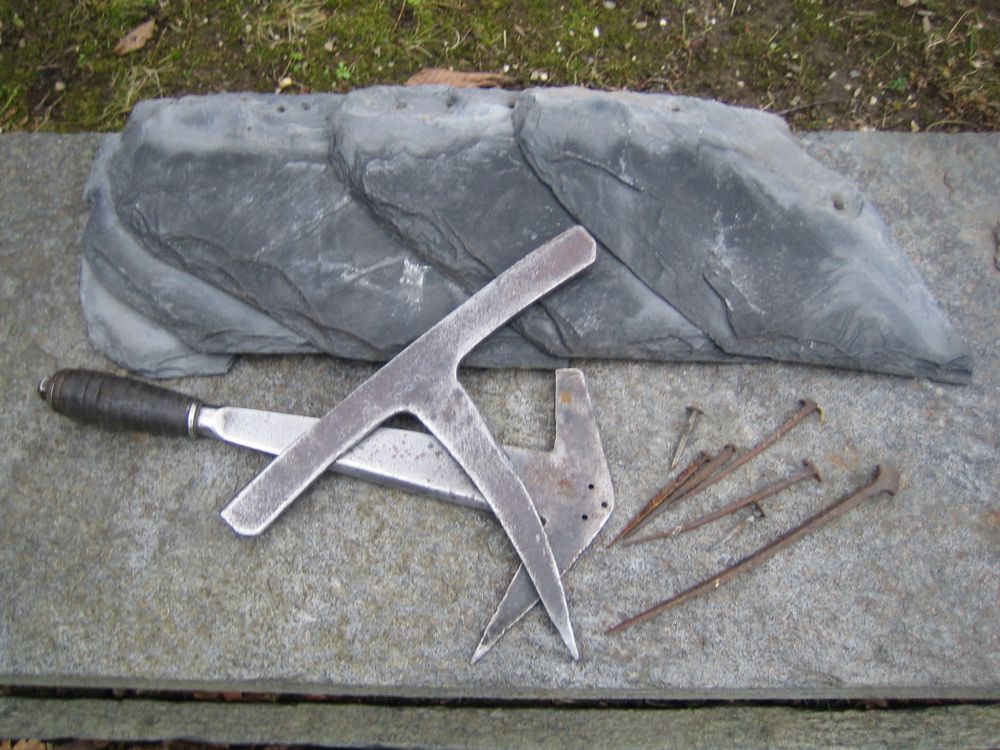 Ein paar alte Schiefer und das passende Werkzeug dazu, sowie handgeschmiedete Nägel.