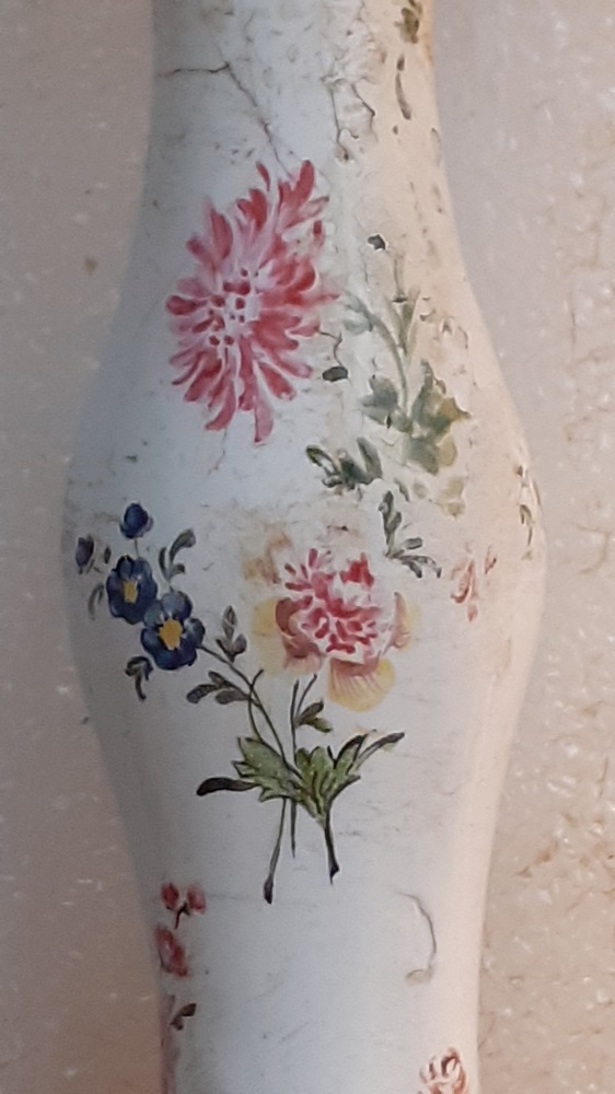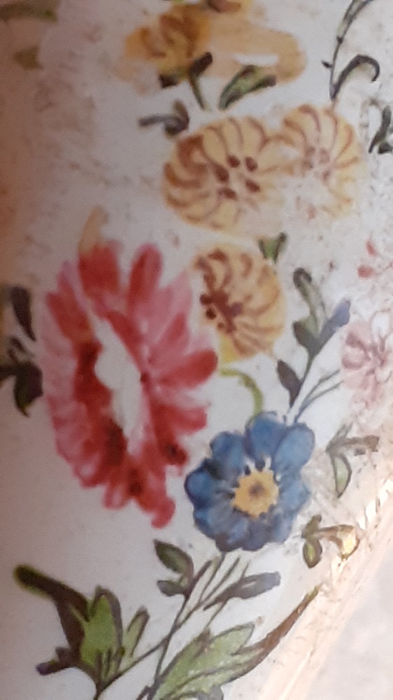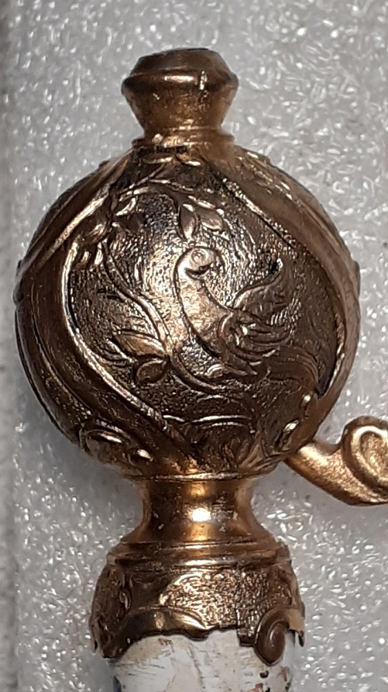 Der Griff besteht aus Porzellan und ist mit feinen Blumenbuketts bemalt.