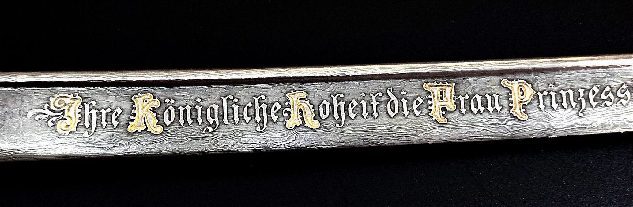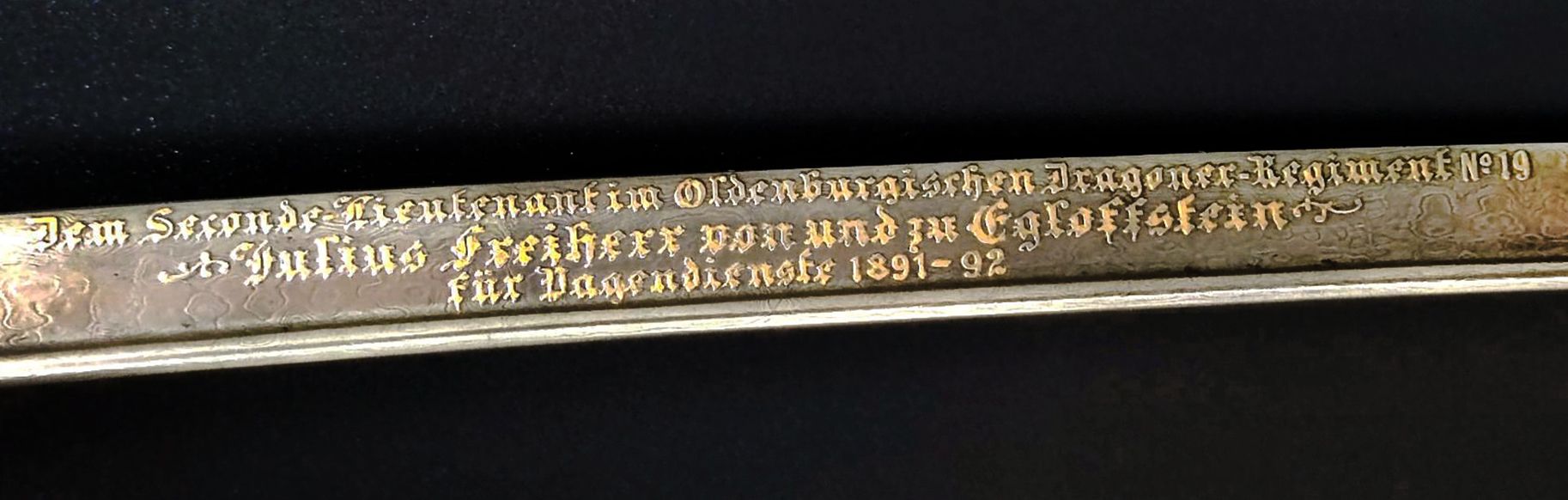 Die Klinge ist im Bereich der Fehlschärfe beidseitig mit erhabenen Inschriften versehen, diese teilweise vergoldet, terzseitig „Ihre Königliche Hoheit die Frau Prinzessin Albrecht von Preussen“, quartseitig „Dem Seconde-Lieutenant im Oldenburgischen Dragoner-Regiment No. 19 Julius Freiherr von und zu Egloffstein für Pagendienste 1891-92“.