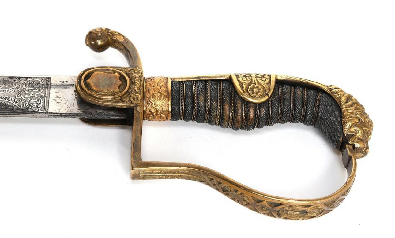 Fine handle in gilt brass with Lion Head Pommel, brass wire wrap to ray skin grip, carved guard with interlooping patterns and foliage, downturned quillion with orb end, saber guard with armorial plaque to one side and the crossed cannon of the artillery regiment to the other. Blade single-edged shallow wide fuller with slight curve and fantastically etched panels of the Solingen armoury around a blackened panel reading "Ohfries. Feld Art. Regt. No62." to the reverse an off-center shallow fuller and vibrantly etched panel with Solingen sides and to the center an incredible scene of the Prussian officers artillery regiment, wheeled cannons & artillery, and soldiers riding to battle. Scabbard in painted black steel with belt loop and squared hook.