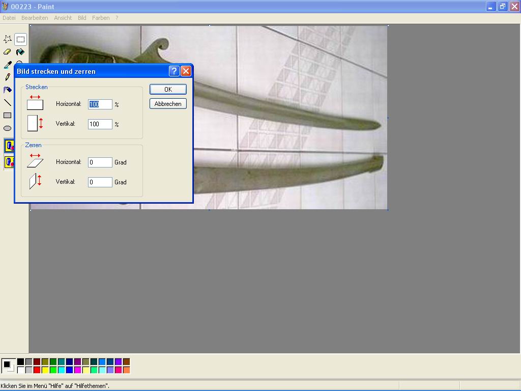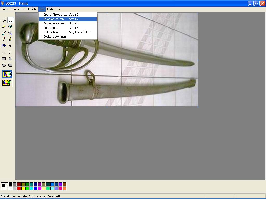 Schritt 3) Um es in seiner Größe zu verändern klickt Ihr auf Bild -> Strecken/Zerren... (siehe Bild_4). Dann erscheint das entsprechende Eingabefenster (siehe Bild_5). In den oberen beiden Eingabefeldern (Option Strecken %), kann nun der angedachte Wert eingegeben werden, auf den man das Bild verkleiner möchte.