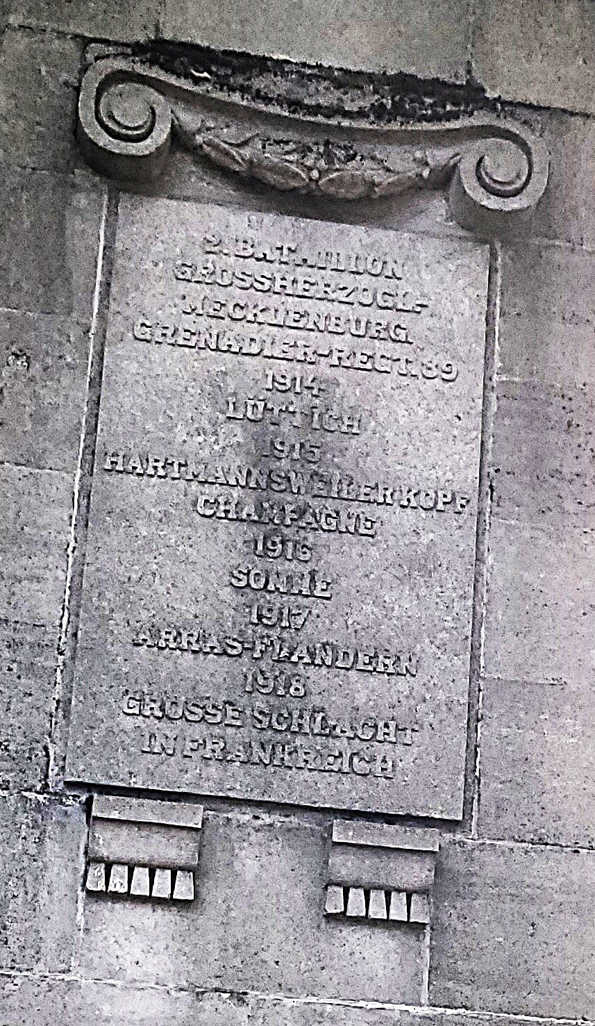 Es wurde laut der Beschriftung auf den Sandsteintafeln des Kriegerdenkmals für die Gefallenen des in Neustrelitz stationierten 2. Bataillons des Großherzoglich – Mecklenburgischen Grenadierregiments Nr. 89 und der 3.Großherzoglich – Mecklenburgischen Batterie des Holsteinischen Feldartillerieregiments Nr. 24 errichtet .