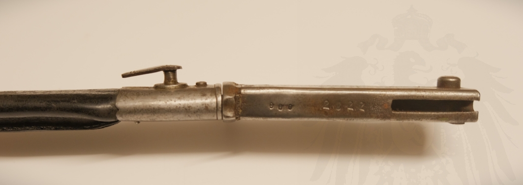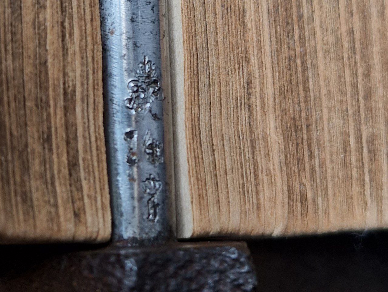 Es wurde auf 23,5 cm gekürzt. Erkennen lassen sich neben mehreren Abnahmestempeln auch die Ziffer 709 an der Klingenwurzel. Auf den Haltebolzen der Griffschalen sind auch ganz klein Abnahmestempel mit R unter Krone zu erkennen. Jedoch sind die so klein, dass mir mit meinem Handy keine scharfen Bilder davon gelungen sind.