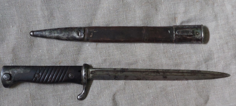 Gekürzte Klinge des S98, aber mit Blechprägegriff, wie er für Aushilfsbajonette typisch ist. Passend gekürzte Lederscheide. Zwei Zahlen auf der Rückenseite des Griffs, sonst keine Stempel, abgesehen vom Hersteller Simson&Co, Suhl.